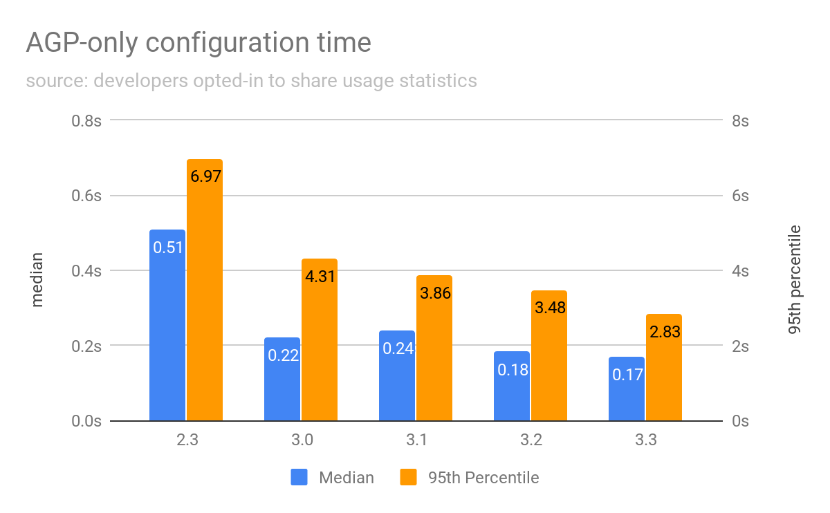 While configuration time can vary based on the number of variants, modules and other things, we wanted to share, as reference point, the configuration time associated with the Android Gradle Plugin from “real-world” dataTools to use